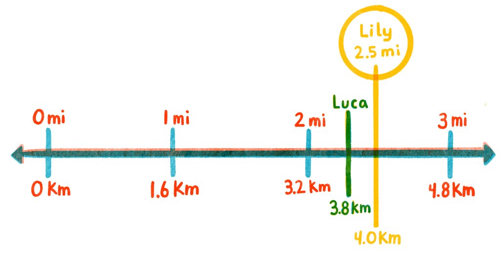 In one activity, students use a number line to solve a question requiring them to compare distances measured in two different units: Luca took his dog on a long walk around his neighborhood. When he got back, he looked at his fitness tracker. It read they walked 3.8 kilometers (km). Luca’s friend Lily also took her dog on a walk. Lily reported she walked 2.5 miles (mi). Who walked a further distance?