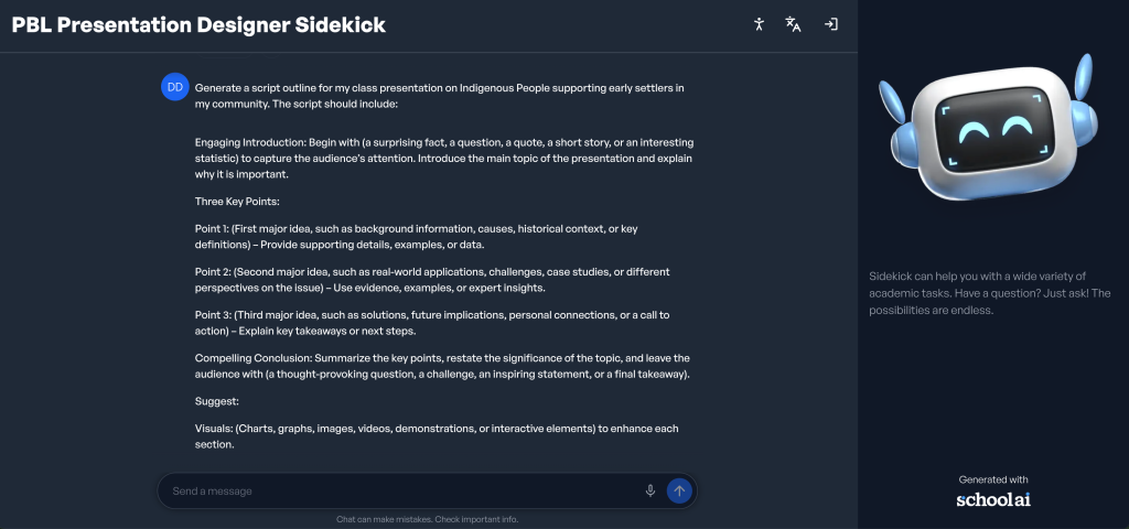 AI can help students create presentations by breaking them into manageable chunks and providing support. Especially in PBL classrooms where individualized attention can be challenging, this AI integration makes a huge difference. Using AI can also create a more inclusive and accessible experience for neurodivergent students in the classroom. Here is a prompt you can share with students to use with the chosen AI tool: