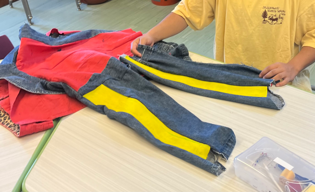 Once students have a sense of what they want to make, Morris and Rose take the class on a trip to a local thrift shop, where they’re given a budget of $20 to buy old clothes and fabrics to use in their upcycled clothing. (They go when the local store offers “Discount Tuesdays,” Morris says, and every item is on sale for just one dollar.) Then, for the final few weeks, students use sewing machines, embroidery machines, vinyl cutters, and heat presses to turn their designs into a reality; students either add new elements to the recycled clothing items to revitalize them, or create entirely new articles of clothing by cutting the old clothes into pieces and sewing those back together.